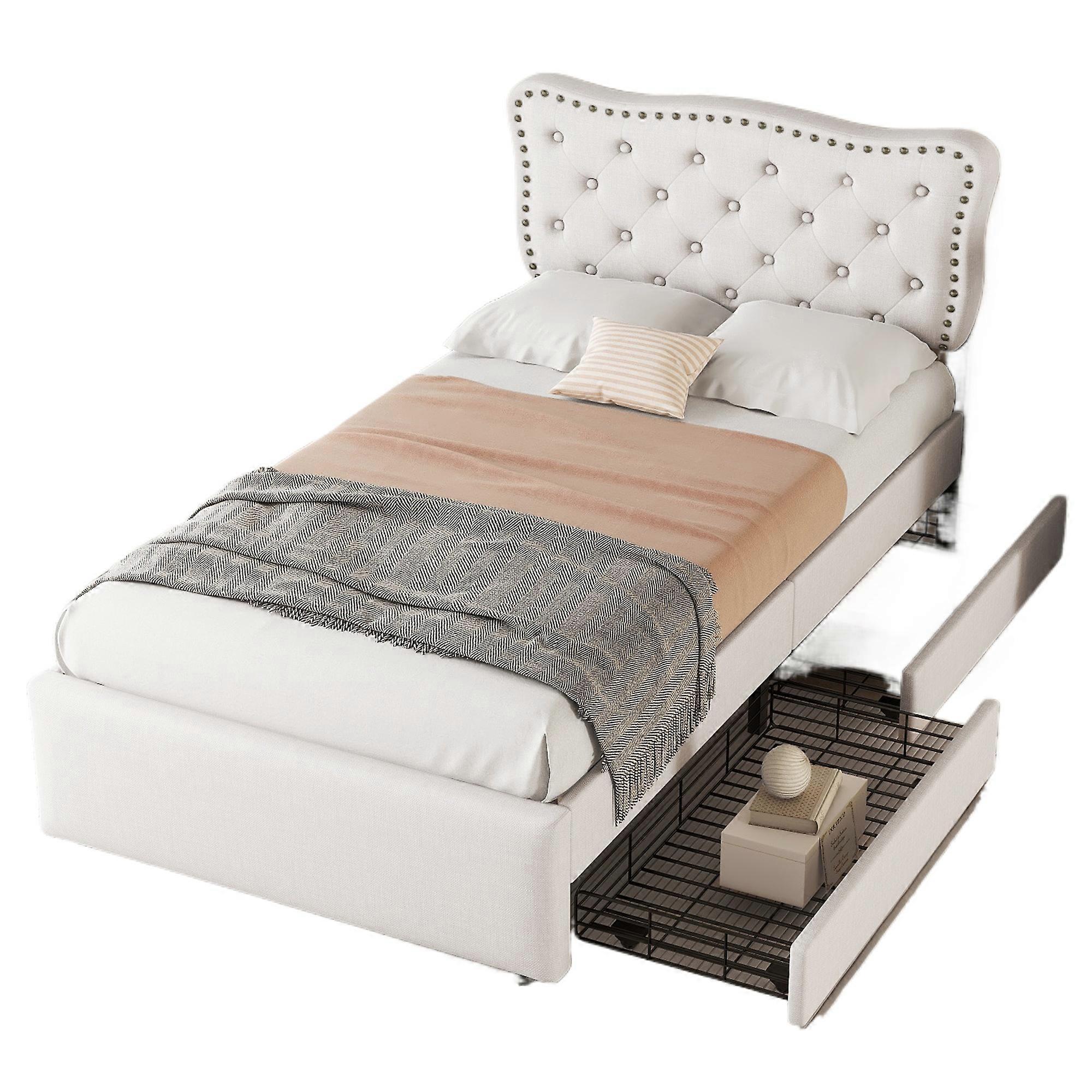 Beige Padded Bed 90x200cm Decorative Studs Double Drawers Bedroom Furniture