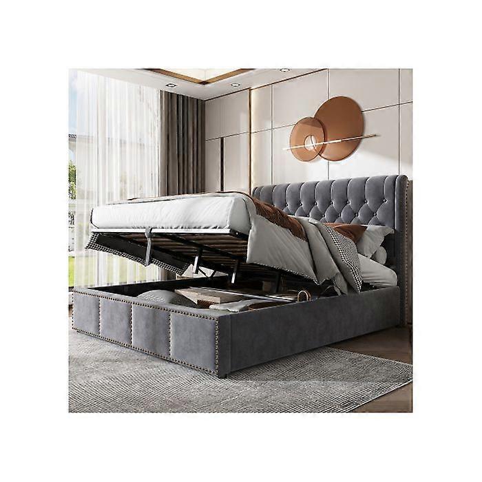 Padded bed, with hydraulic lever, riveted decoration, 140 x 190 cm, without mattress, velvet, gray