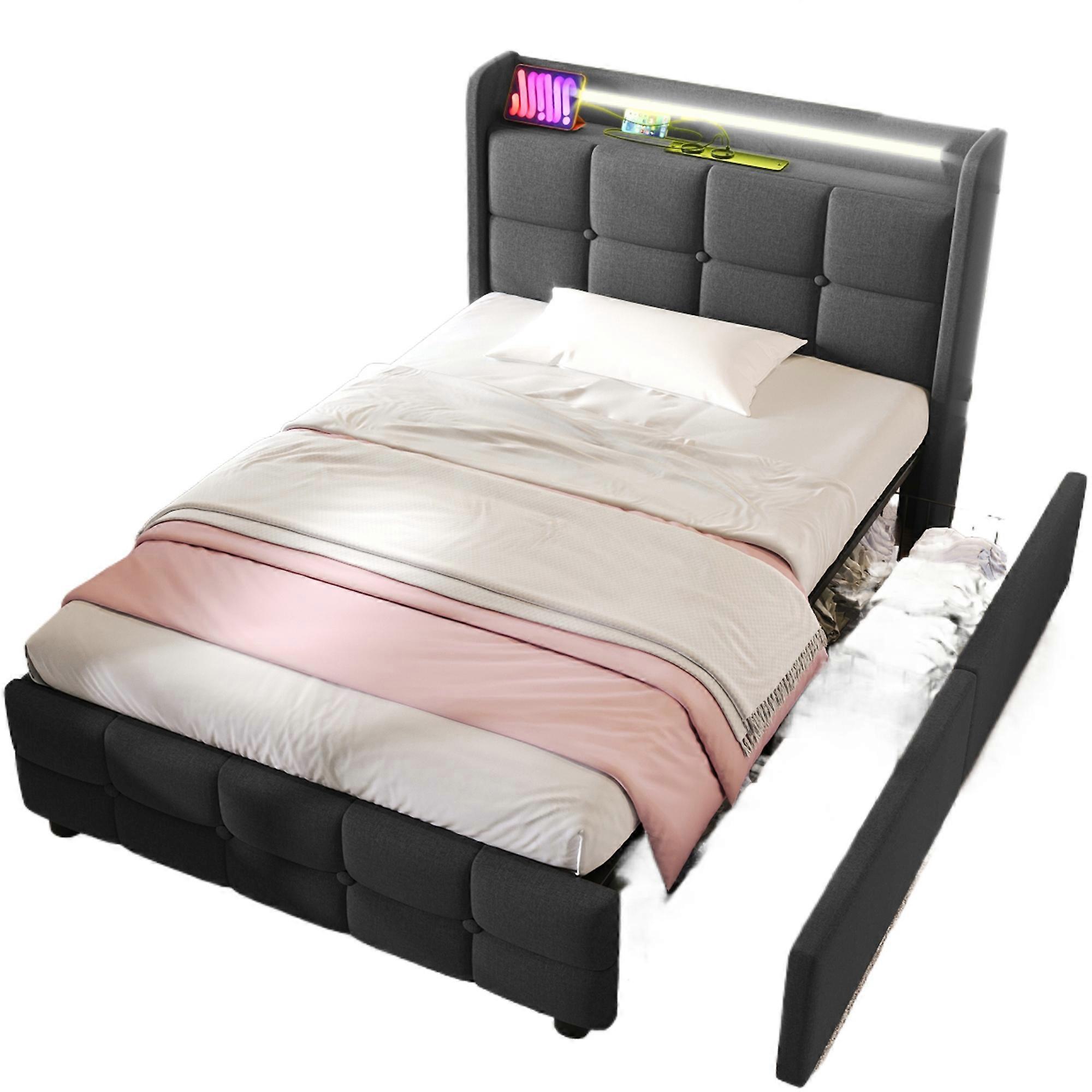 LED USB Single Storage Bed Frame Gray Wood 90x200cm Slatted Wooden