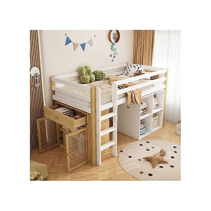 Raised children's bed with 2 storage boxes and ladder, without mattress, 90 x 200 cm, natural + white