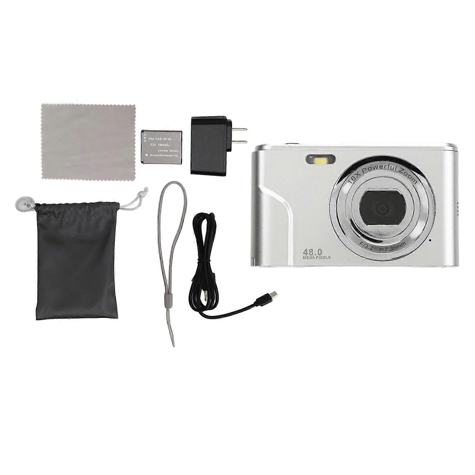 Digital Camera 48MP 16X Zoom 1080P HD 2.4 Inch IPS Display Mini Compact Pocket Camera US Plug 100240V Space Silver