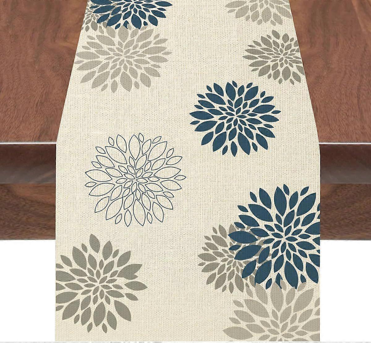 Soft&Sturdy MaterialThe blue gray table runners are made of burlap material.Dahlia pinnata flower table runners are soft,durable and sturdy sewing,no smell and will not fade. CLASSIC DESIGN GIFTThis table runner design with dahlia pinnata pattern , fashion & gorgeous, create a stylish elegance dining environment, improve your life quality! It also can be a perfect gift for your friends or family who moving to a new place. Design&StyleDahlia Pinnata Flower table runner pattern is painted by the original designer;Unique blue grey farmhouse table runners use environmentally friendly longlasting dyes with bright colors to illuminate your home. EASY USE & EASY CAREMachine washable or hand wash clean recommended on a cold water.Iron farmhouse style table runners at low temperature to get out the fold lines/wrinkles.Don't BLEACH! Perfect Size & Great DecorationThe blue grey burlap 72 inches long table runner, appropriate for a table that can seat 46 people. Let the family and guests who are dining together have a good mood.Please measure your table length before purchasing.The table runner is not only perfect for dining table, but also suitable for coffee table, TV stand, dresser, etc, greatly renewing your home decor.