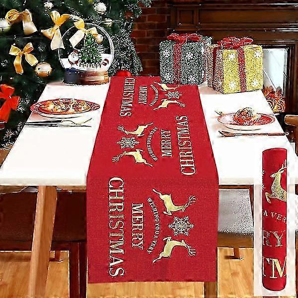 Christmas Table Runner, Red Linen Cloth and Decoration Runner with Gold Colored Elk and Snowflake, 12 x 108 Inch Long