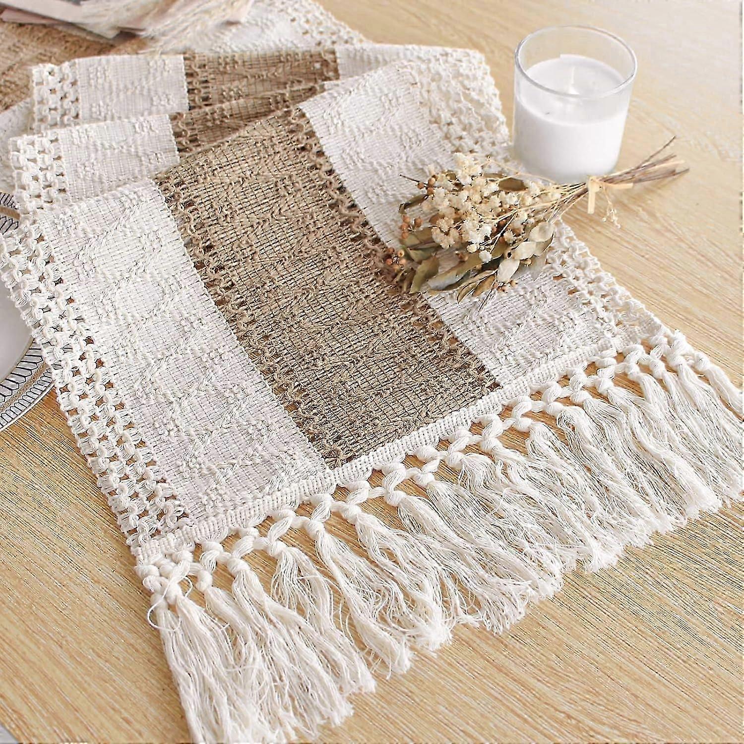 Polyester, Cotton [High Quality Materials] Each of our Bohemian table runners is made of cotton, linen and polyester, which is thick and durable, soft to touch, easy to clean and easy to flatten. [Perfect 72 inches long] Our tassel fringe table runner measures 12 x 72 inches, suitable for dining tables that accommodate 4-8 people. It can make your dining table look rustic and bohemian. (Because it is folded in the bag, there will be creases when you take out the table runner, which will affect your size. So, before measuring, please make sure the table runner is neat and flat) [Multiple Occasions] The Bohemian table runner is a great choice for your bohemian home decoration, and also a good decoration for life events such as weddings, parties, bridal showers, baby showers, birthdays, etc. Amazingly, this table runner can be a gift for friends or family members on holidays, Thanksgiving and birthdays. [Bohemian Home Decor] This farmhouse table runner is not only suitable for bohemian style dining room decoration, bedroom decoration, desk, storage table, coffee table, but also suitable for piano countertops, TV stands, bookshelves, etc. Washing instructions: It is recommended to hand wash gently with cold water. Or use a laundry bag for gentle machine wash. Do not rub. Do not bleach. Lay flat or hang to dry. Due to the use of natural materials, it may shrink slightly after washing, but it will not affect continued use.