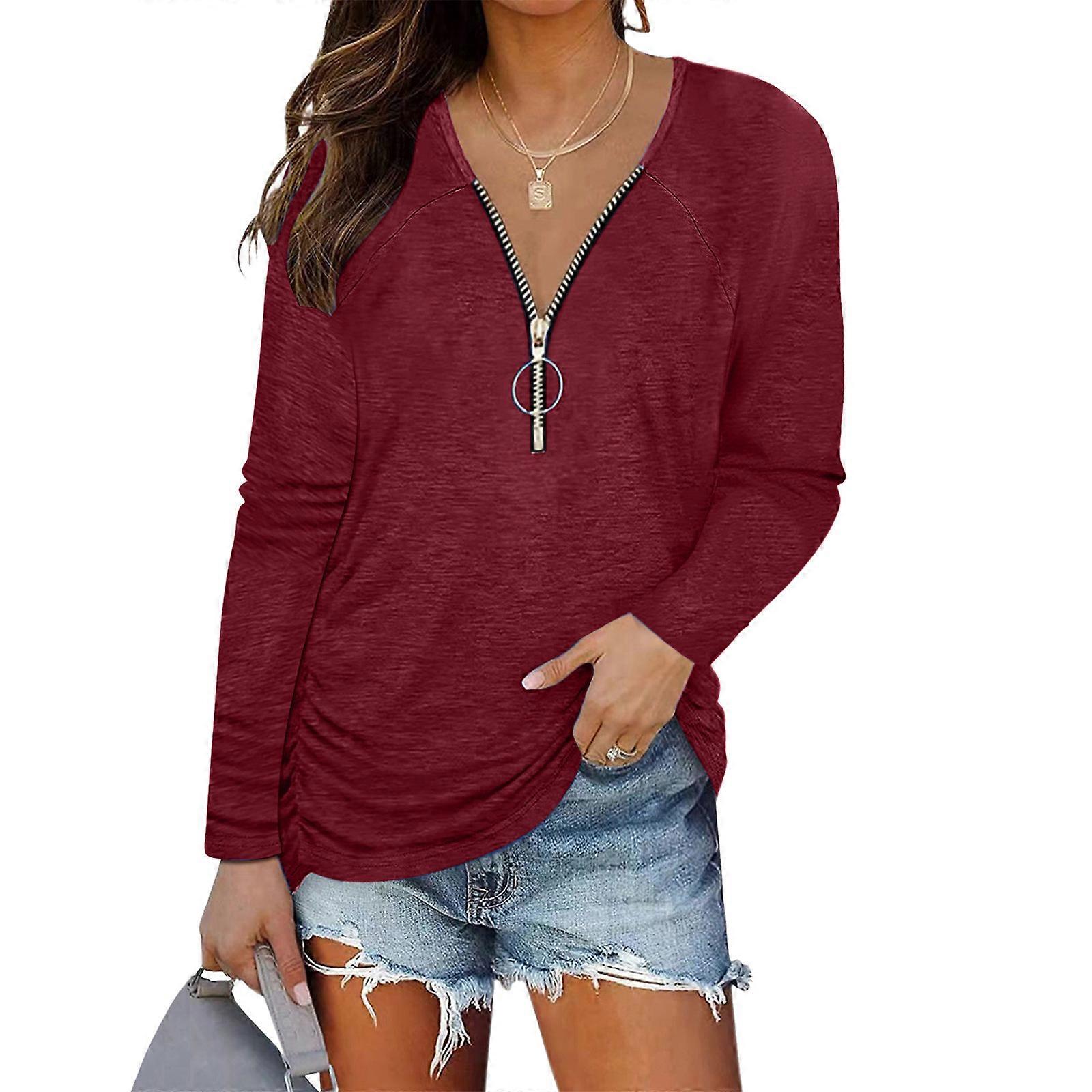 V Neck Zipper Shirt Women Long Button Up Shirt V Neck Tunic Tops Fitted Tops Long Sleeve Henley TShirts Button Down Slim Claret XL.