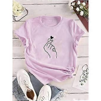 Camiseta feminina moderna com estampa simples de dedos comparados a um coração, divertida e casual, com gola redonda e mangas curtas, ideal para o verão.