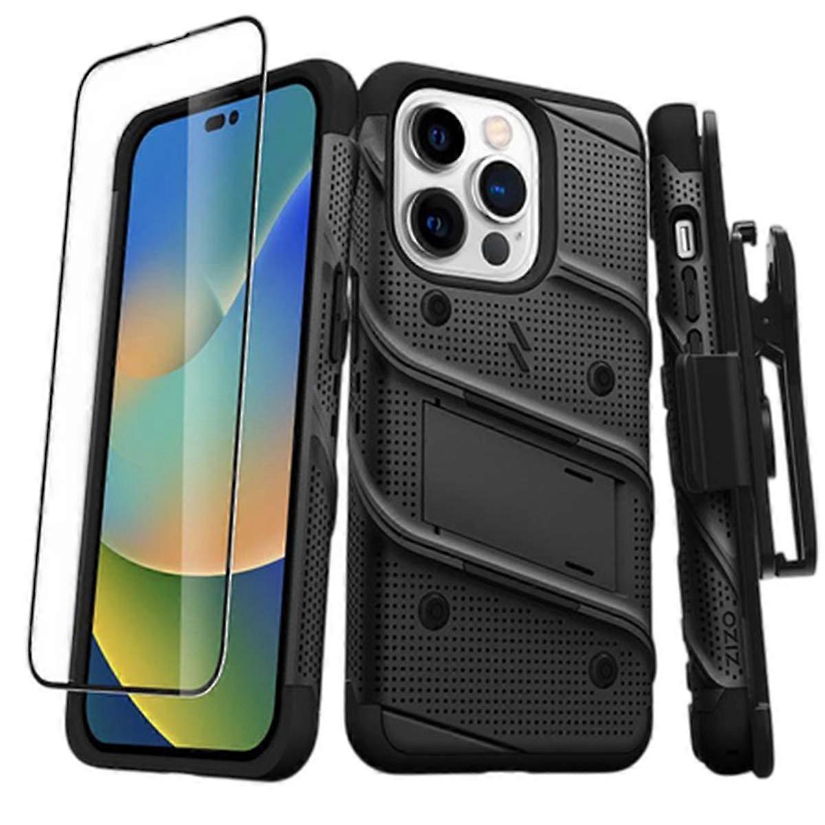 Bolt Shielded Case iPhone 14 Pro with Stand and 9H Ultra Resistant Tempered Glass, Black