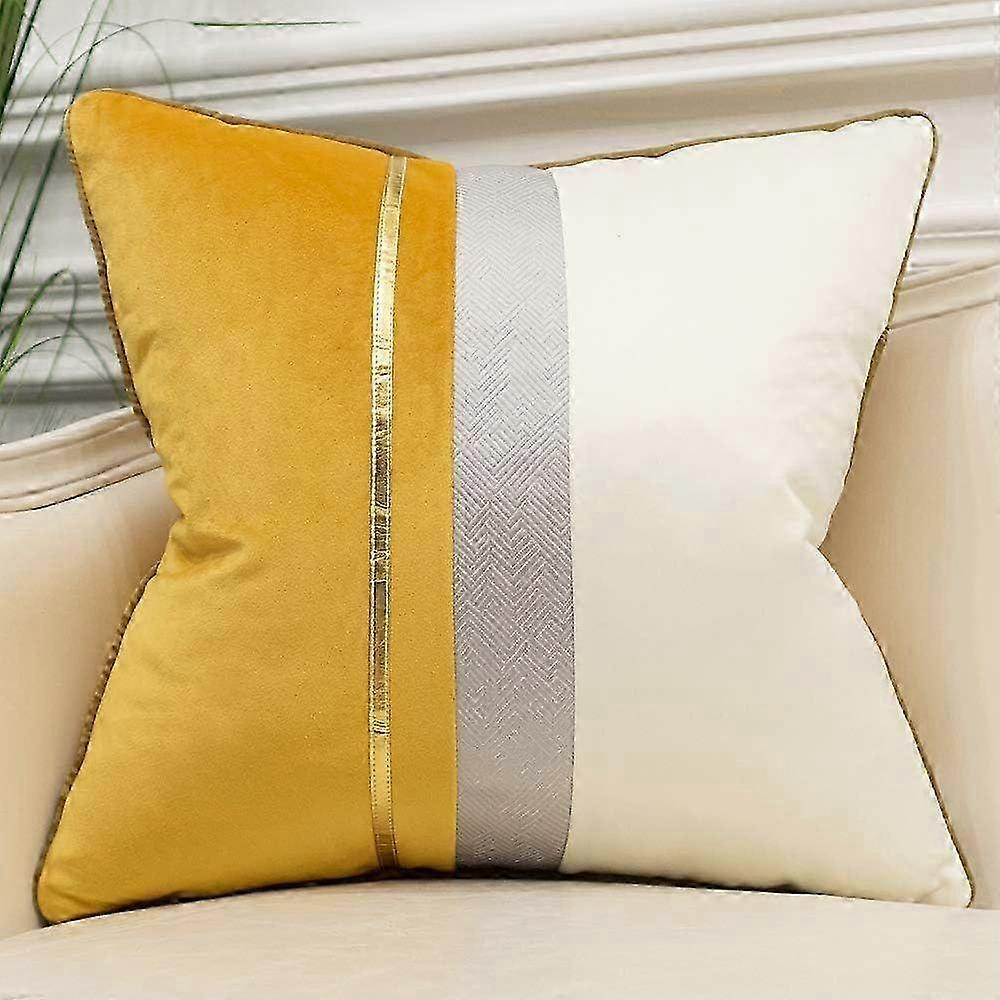 20 X 20 Inches Yellow White Gold Leather Striped Patchwork Velvet Cushion Case