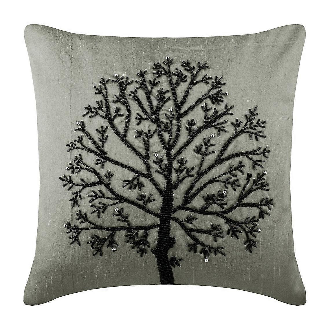 Silver Tree of Life Cushion Cover, 20x20 inch Beaded Floral Pillow Case, Square Silk Decorative Pillow Cover