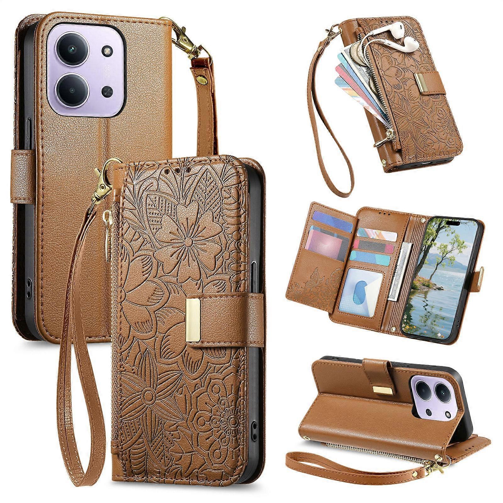 Flowers Leaves Zipper Wallet Leather Phone Case with Strap