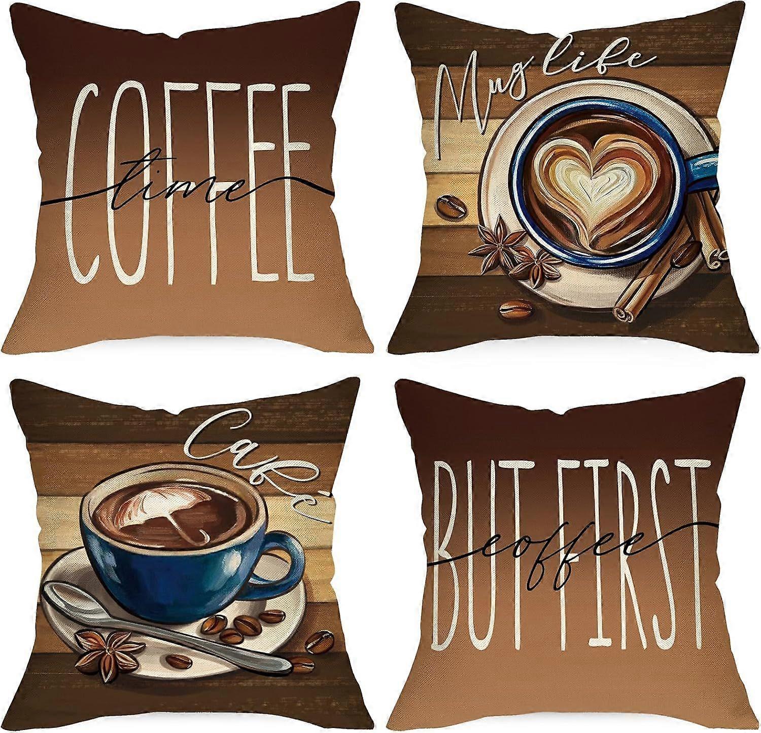 Coffee Themed Decorative Throw Pillow Covers 18 x 18 Set of 4, But First Coffee