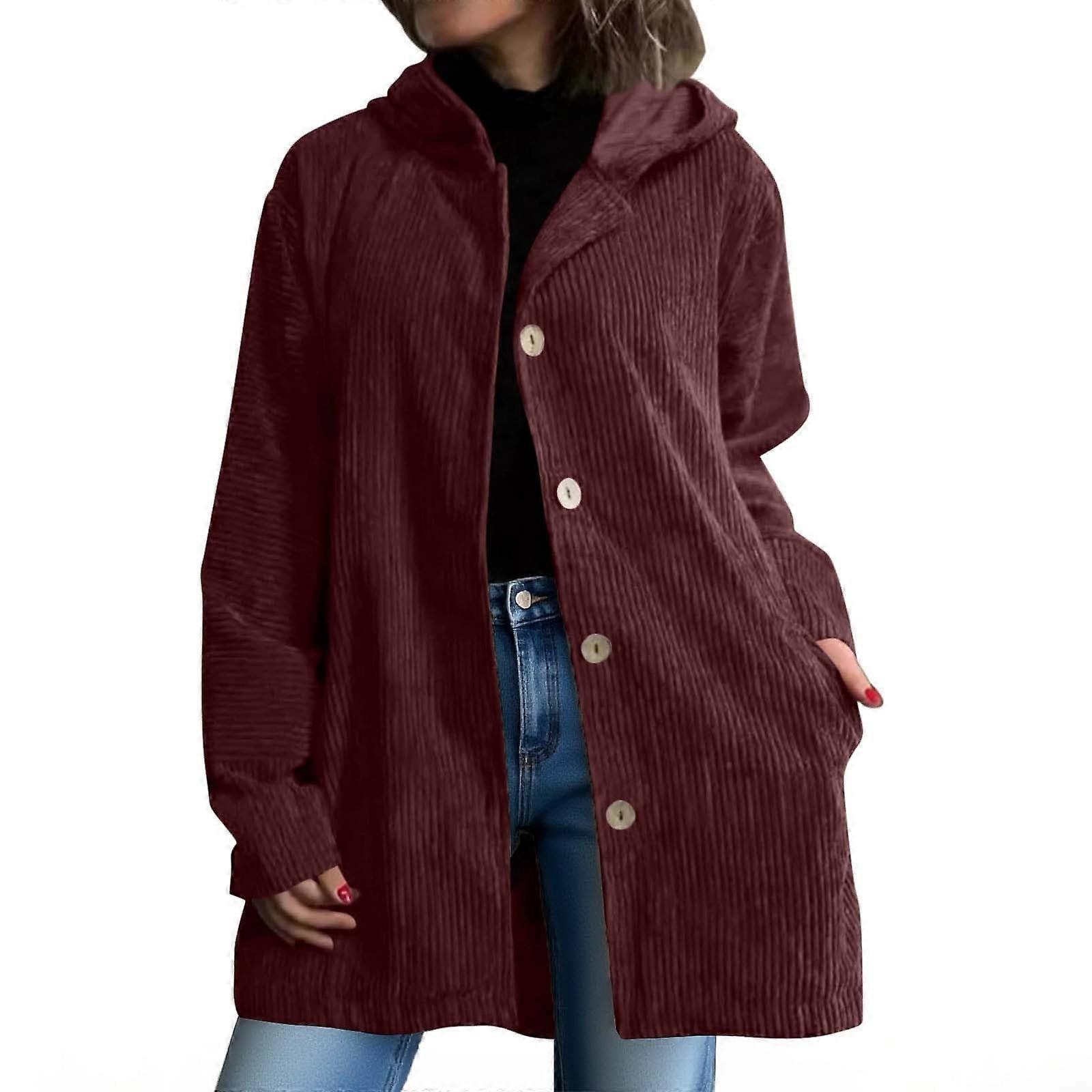 Women's Oversized Corduroy Hooded Coat, Lightweight Casual Fall Button Jacket Loose Comfy Fashion Outfits with Pockets Burgundy XL