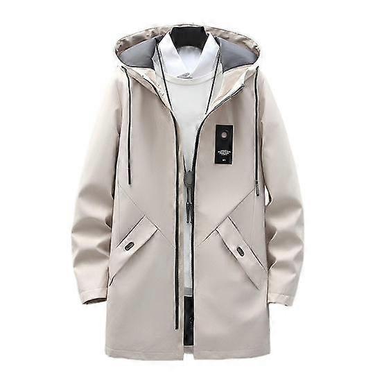 Men Trench Coat Hooded Drawstring Long Sleeve Mid-Length Jacket with Pockets Solid Color Zipper Placket Windbreaker