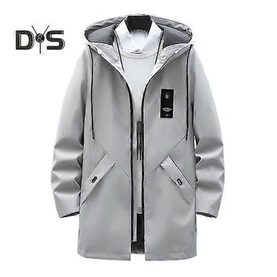 Men Trench Coat Hooded Drawstring Long Sleeve Mid-Length Jacket with Pockets Solid Color Zipper Placket Windbreaker