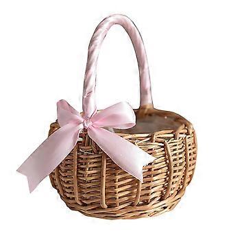 Wicker Woven Flower Basket, with Handle and Pink Ribbon, Wedding(S)