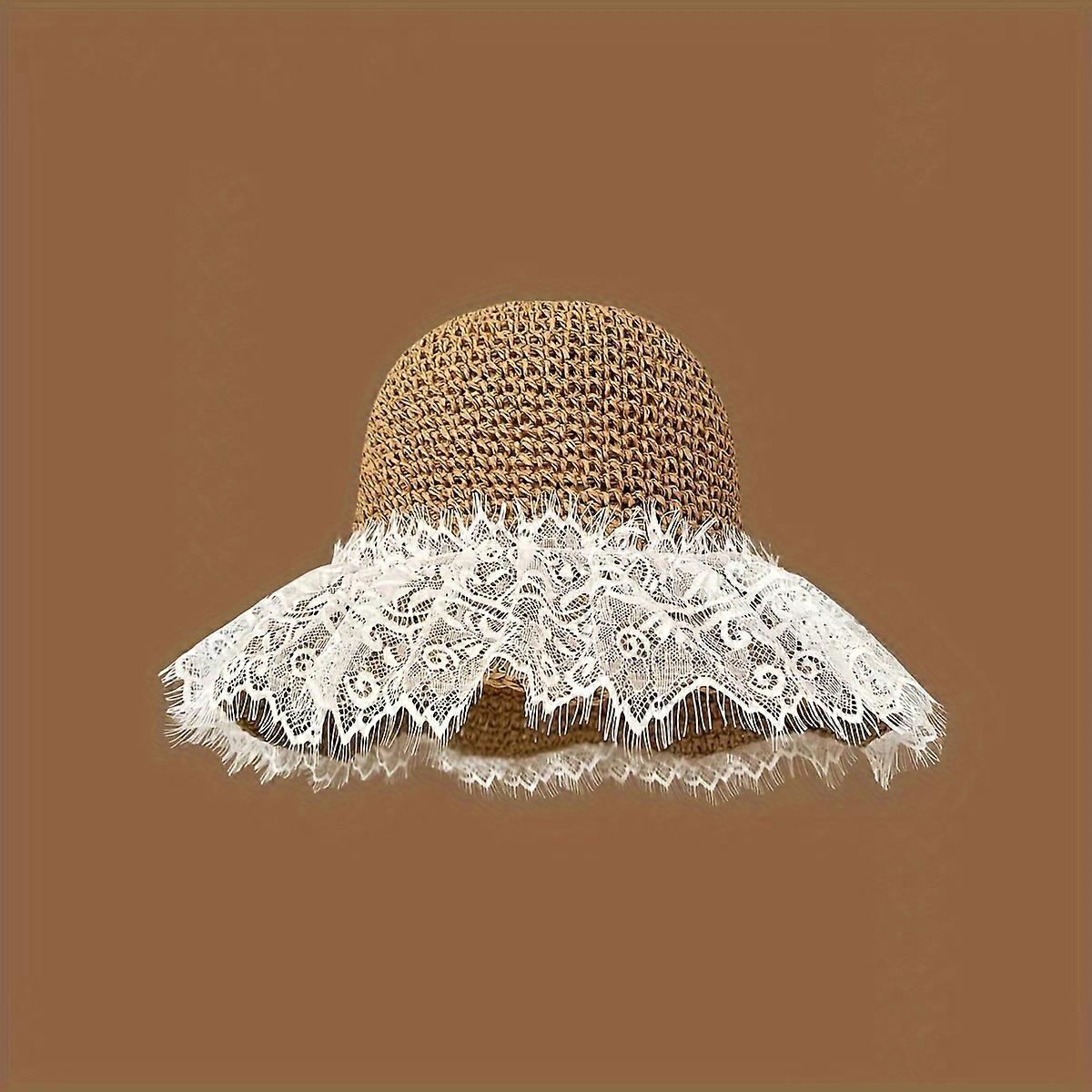 Women's Wide Brim Sun Hat With Lace Trim, Straw Beach Cap, Foldable And Packable, UV Protection Travel Essential Dome Hat