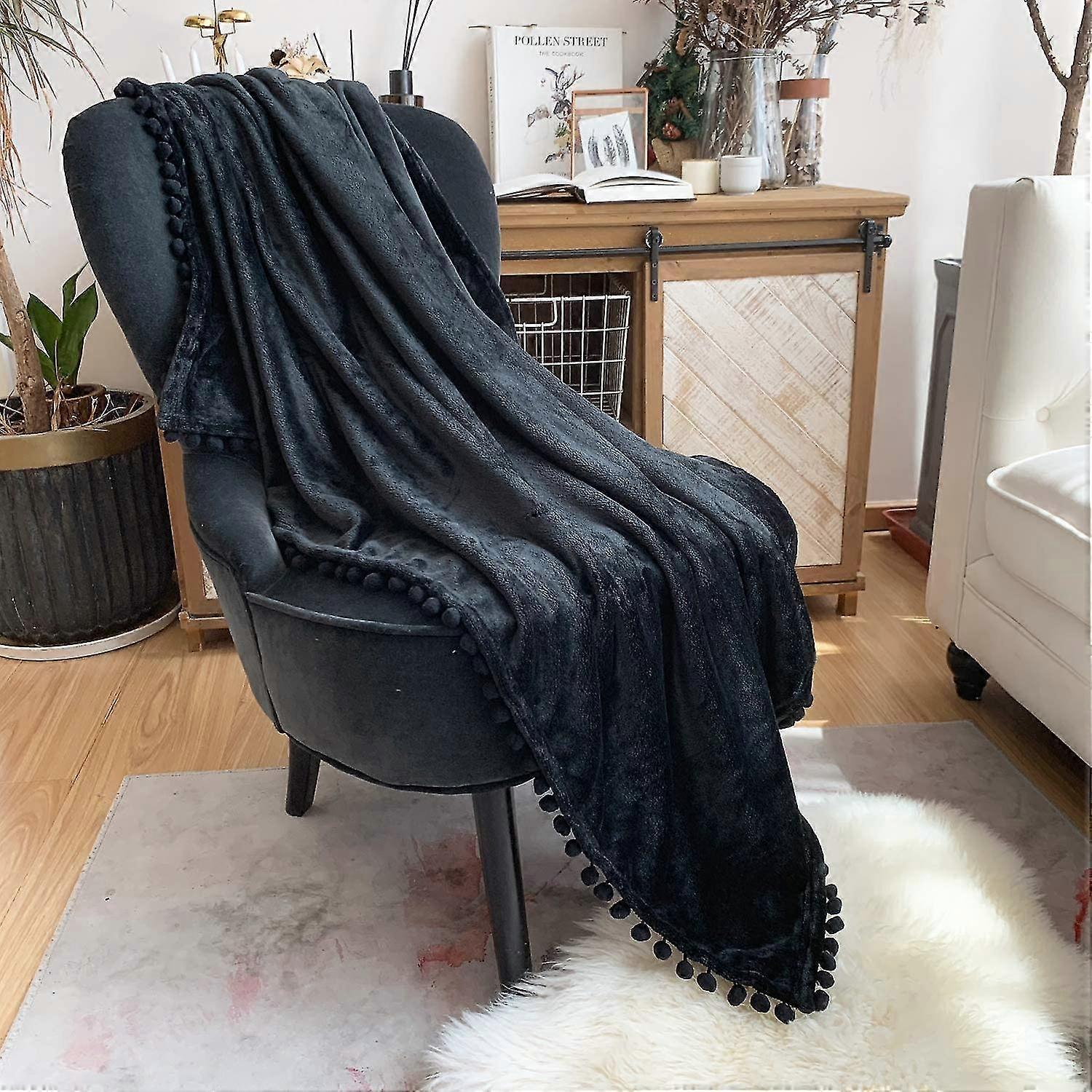 Flannel Blanket With Pompom Fringe Lightweight Cozy Bed Blanket Soft Throw Blanket Fit Couch Sofa Suitable For All Season (black, 51''x 59'')