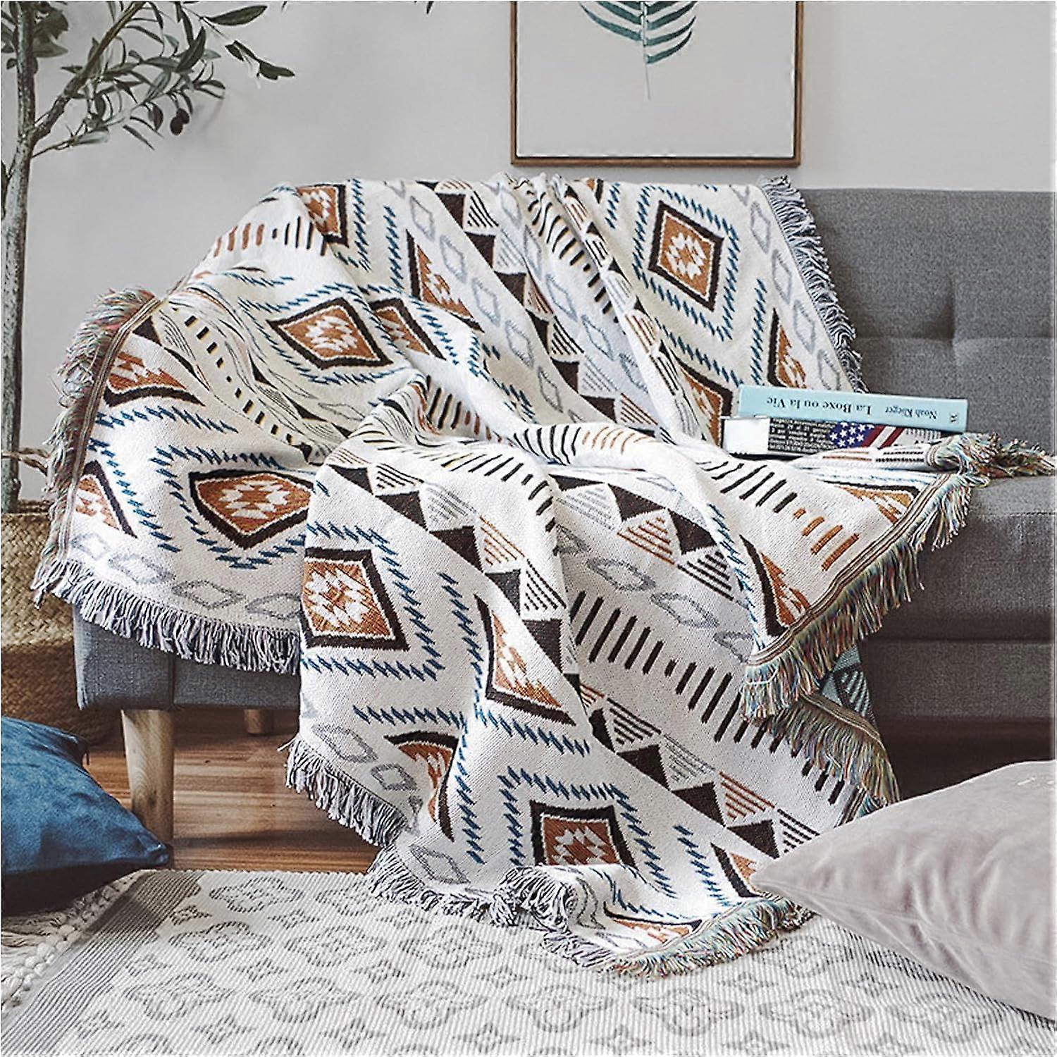 Sofa blanket with pompom, sofa blanket, knitted blanket, Aztec ethnic style blanket, suitable for home and office (geometric pattern 130*180cm)