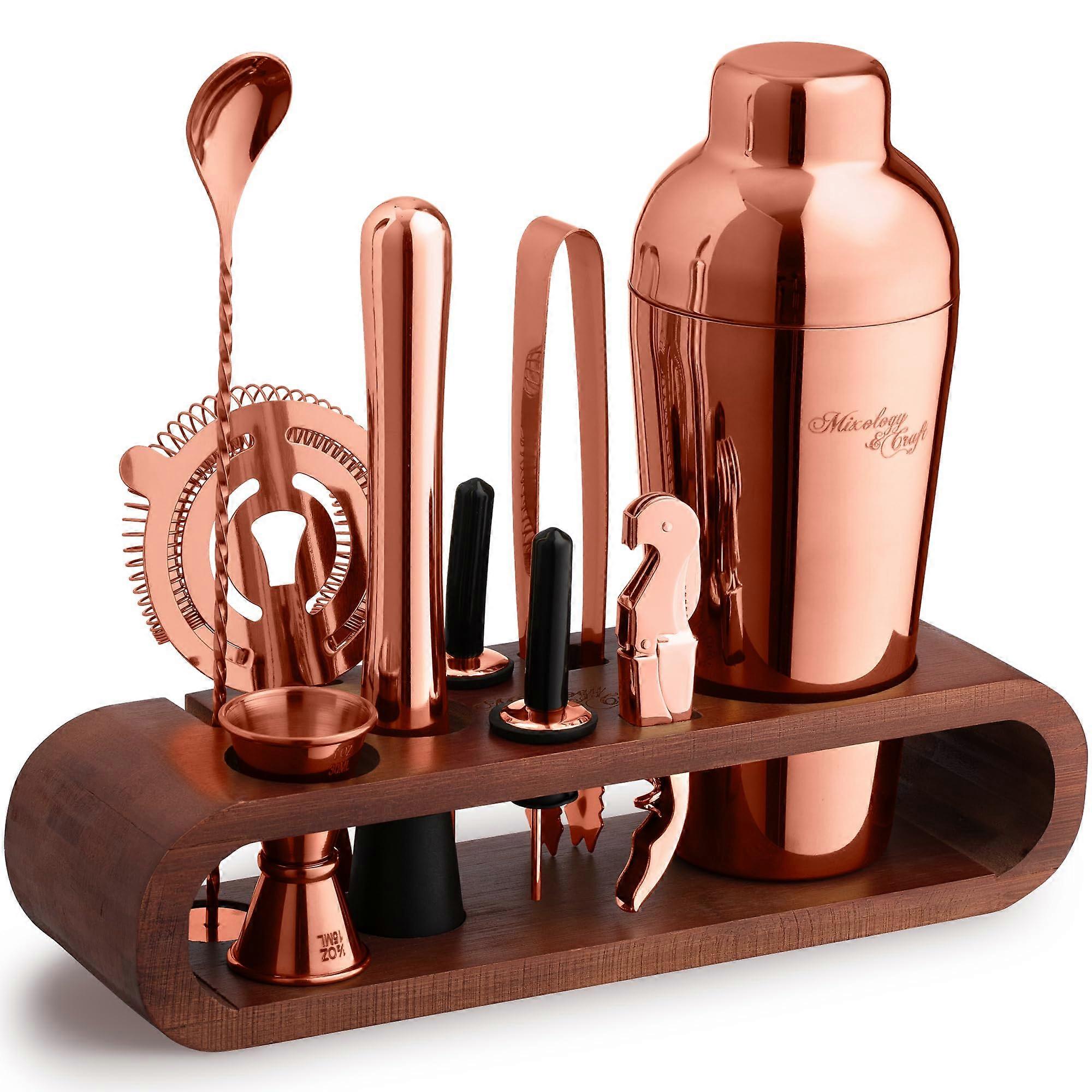 Cocktail shaker set, 10-Piece Bar Tool Set with Dark Bamboo Stand, Bartender Kit, Copper
