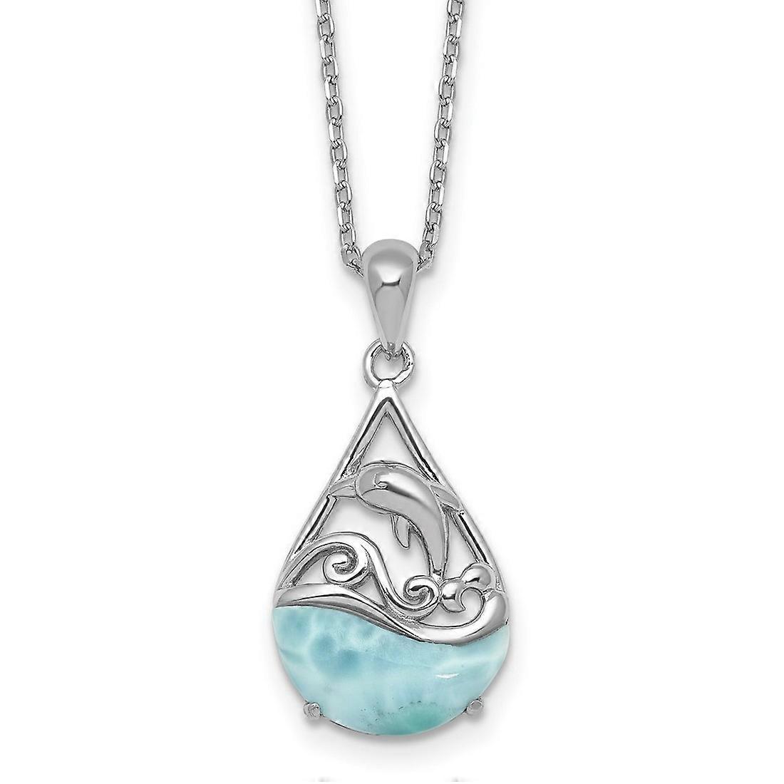 925 Sterling Silver Rhodium Plated Larimar Dolphin Teardrop With 2in Extension Necklace 16 Inch Pendant-Necklace for Wom