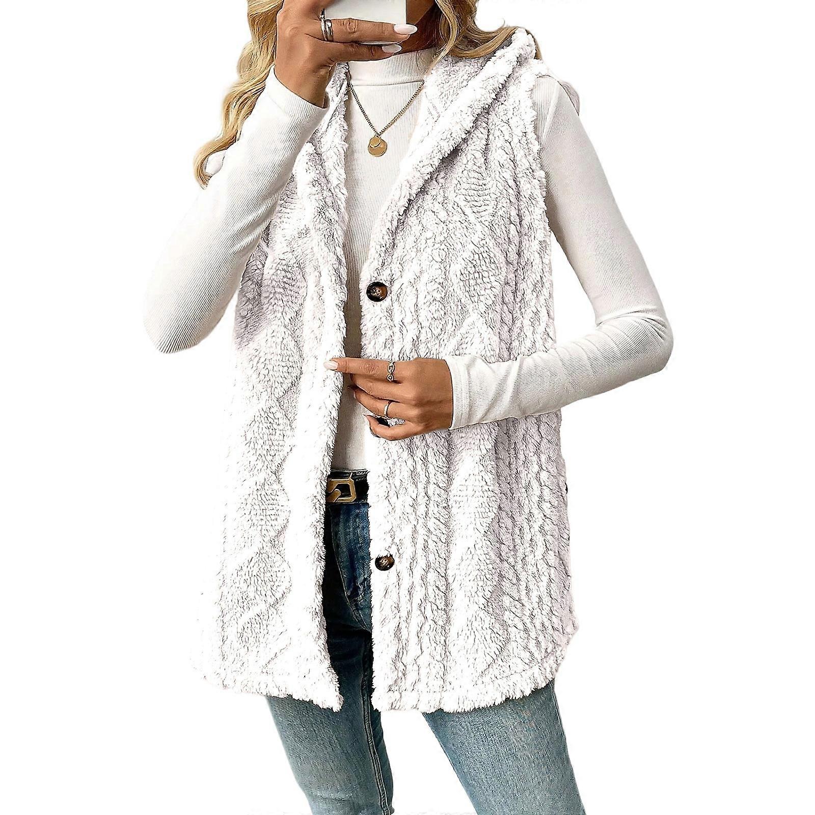 Women's Hooded Vest Winter Wool Button-Up Long Vest Jacket Warm Lightweight Autumn Outerwear White XL