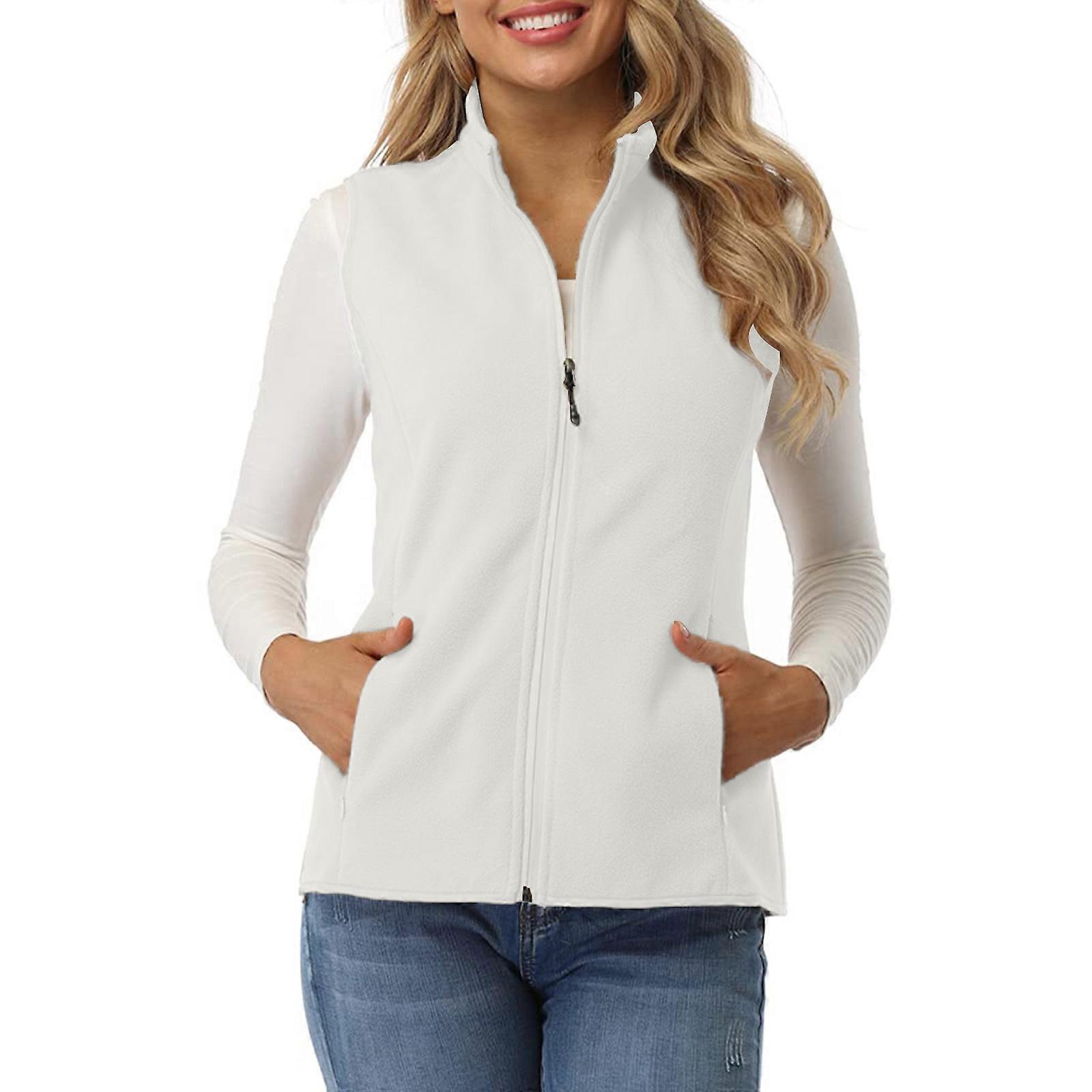 Women's Wool Soft Sleeveless Zipper Pocket Stand Collar Polar Fleece Vest Jacket White XL