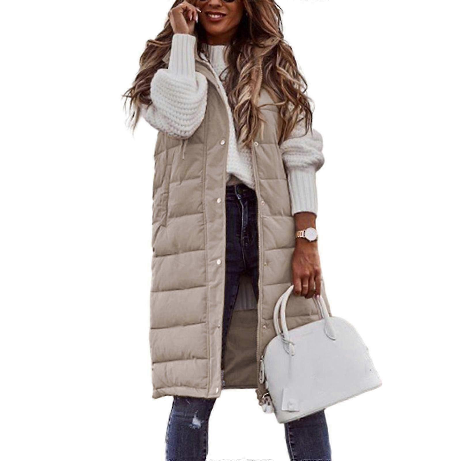 Women's Fashionable Hooded Long Sleeveless Puffer Vest with Full Zipper, Winter Warm Gilet Coats Outerwear, Puffy Jacket for Women in Khaki