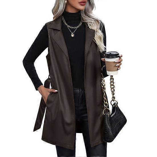 Women Fall Spring Vest Coat with Belt Lace-up Waist Turn-down Collar Smooth Faux Leather Mid Length Cardigan Commuting Shopping Lady Waistcoat