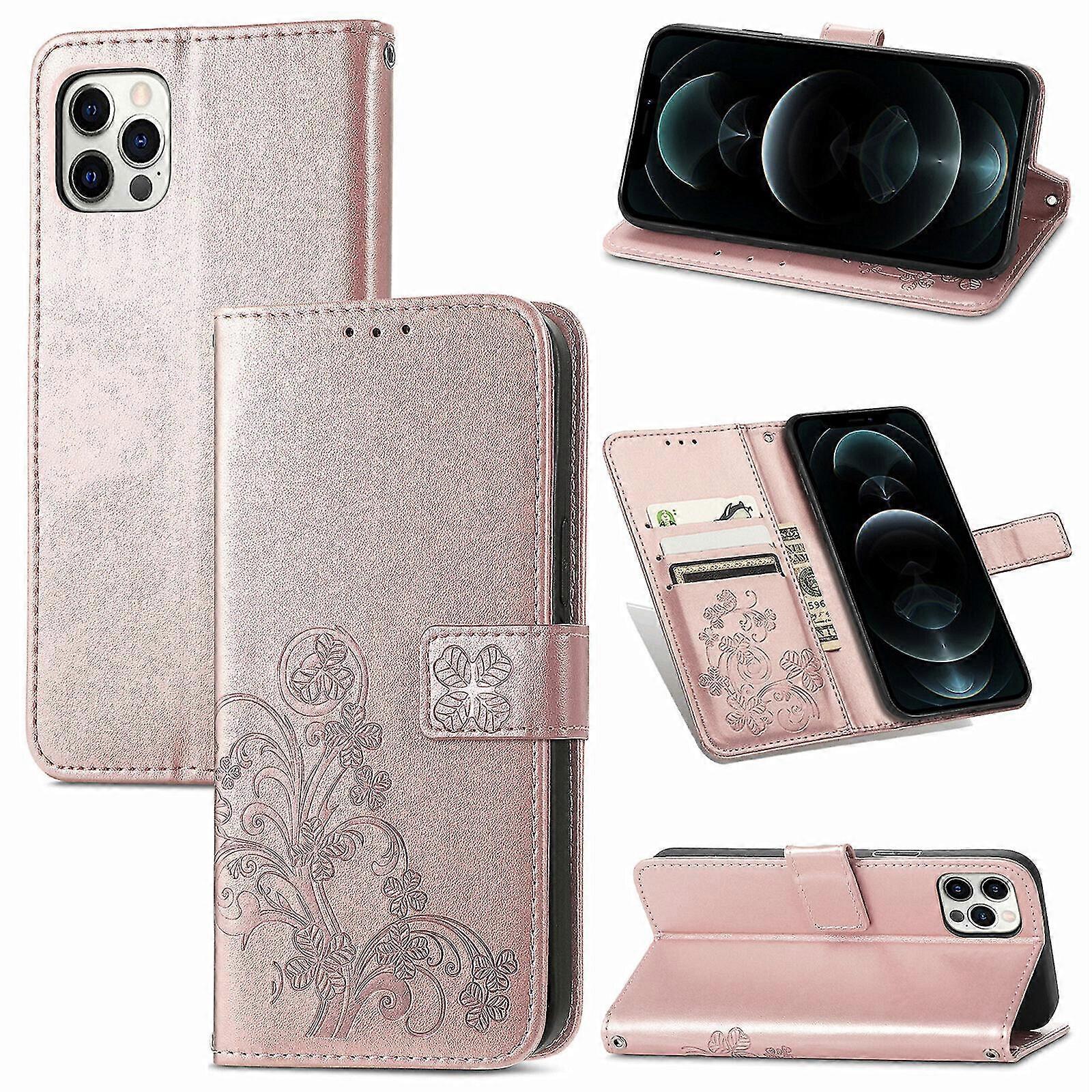 Compatible With Iphone 12 Pro Cover Wallet Clover Embossed Protective Leather Phone Case Magnetic - Pink