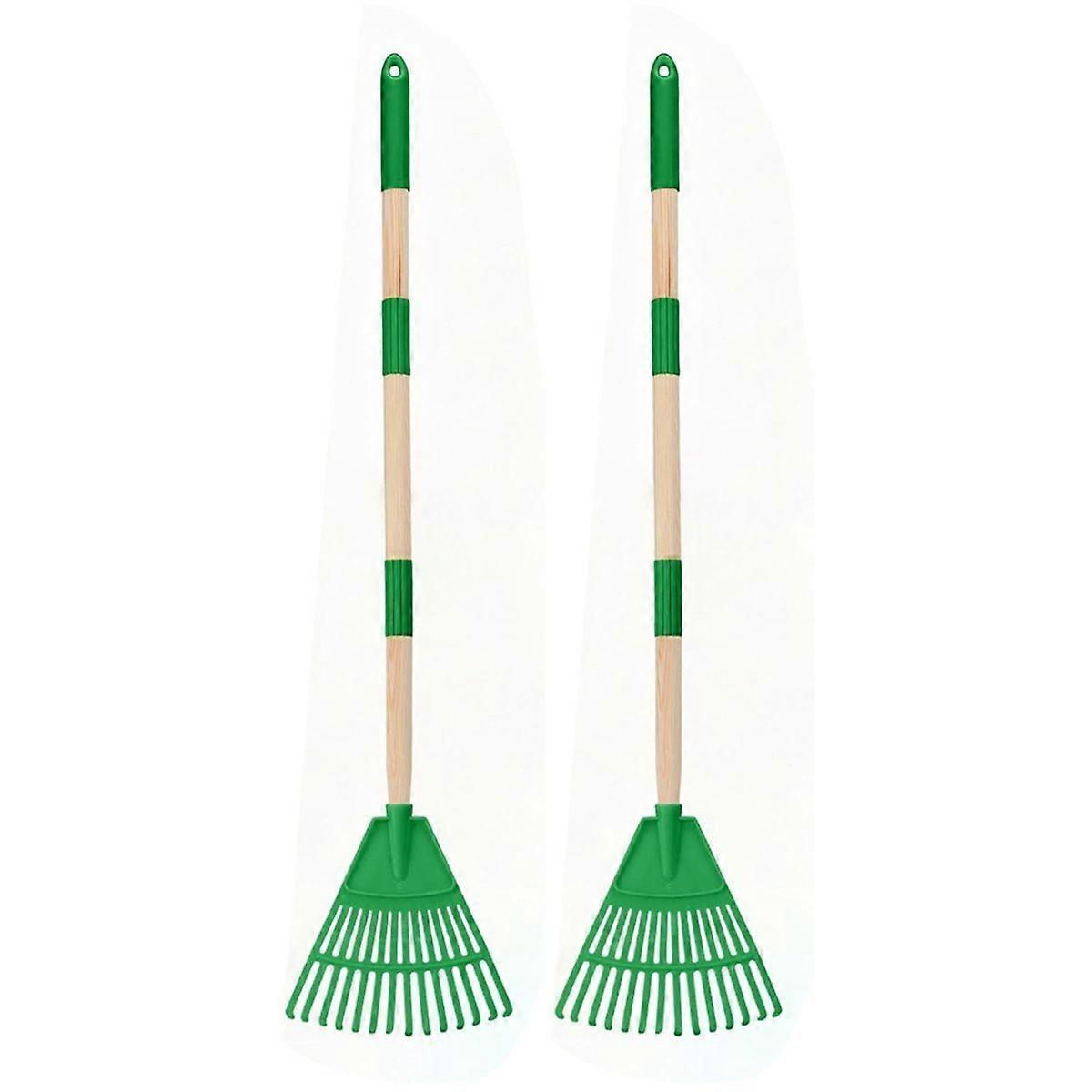 Potential of Little : These 2 pieces of green plastic rakes are designed especially for kids ages 3-10, spark kids' potential to become , and encourage them to safely imitate adults to clean fallen leaves, cultivate a sense of achievement in labor, and a desire to explore nature. Child-Friendly Design: Each plastic rake is 34inch x 7.9inch and features a plastic head and smooth wooden handle-just 1/3 the weight of adult tools. Ergonomically sized for little hands to improve coordination without the risk of injury. Safe & Materials: The rake head is made of odorless, non- plastic with rounded edges. The natural wood handle is sturdy and for a comfortable grip. It is safe for kids and built to last through all seasons. Great Tool for Spending Funny Family Time: Our rakes for leaves are perfect for parent-child yard projects! Clean up leaves, grass, or garden debris together while teaching kids responsibility and environmental care through a hands-on activity. Perfect for Various Occasions: They can be assembled in 15 seconds and are easy to store. The rakes are great for backyard play, school gardening activities, or as outdoor tools for parties and events. Color: Green Material: Plastic+Wood Package Contents: 2 Pcs x Kids Rakes Only the above package content, other products are not included. Note: Light reflection and different displays may cause the color of the item in the picture a little different from the real thing. The measurement allowed error is +/- 1-3cm.