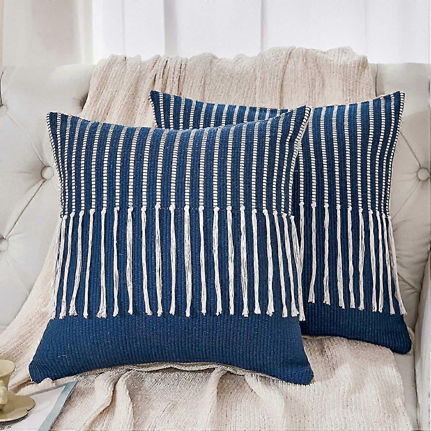 Set of 2 Decorative Cushion Covers with Fringe, Chic Tasseled Throw Pillow Covers in Blue Woven Design, Suitable for Various Brands, 18 x 18