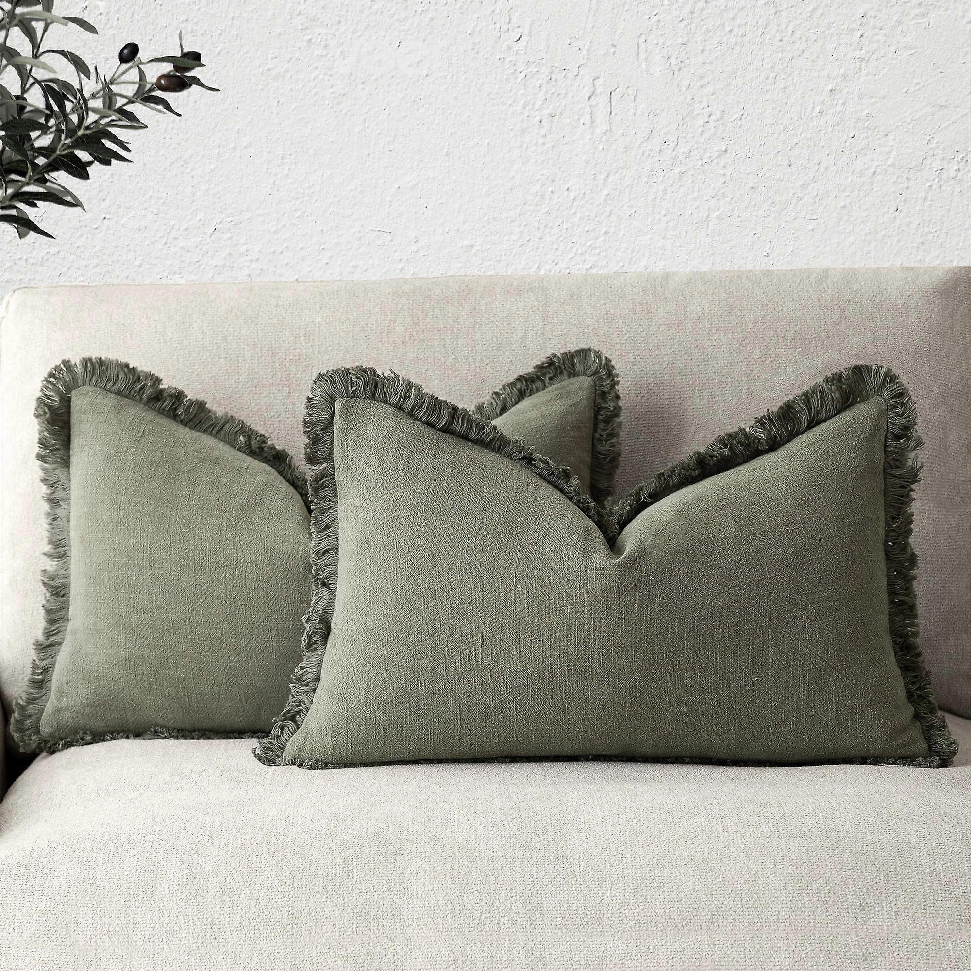 Set of 2 Olive Green Decorative Linen Fringe Lumbar Pillow Covers 12x20 Inch Boho Farmhouse Cushions with Tassels