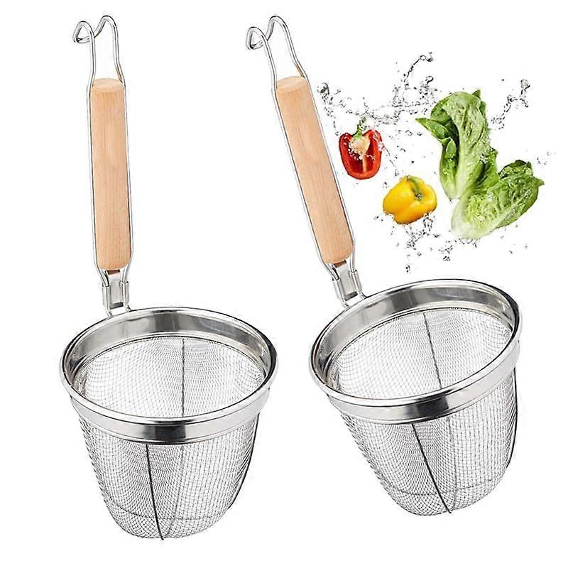 Stainless Steel Noodle Strainer Set of 2 with Wooden Handle Multifunctional Serving Basket and Spoon for Chinese Cooking