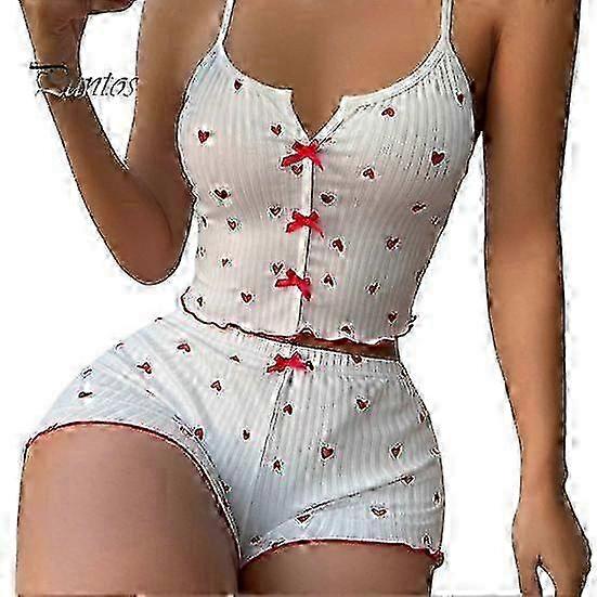 2Pcs/Set Lady Homewear Top Shorts Suit Heart Print Bow Decor Sleeveless Backless Vest Elastic High Waist Short Pants Camis Shorts Outfit Lad