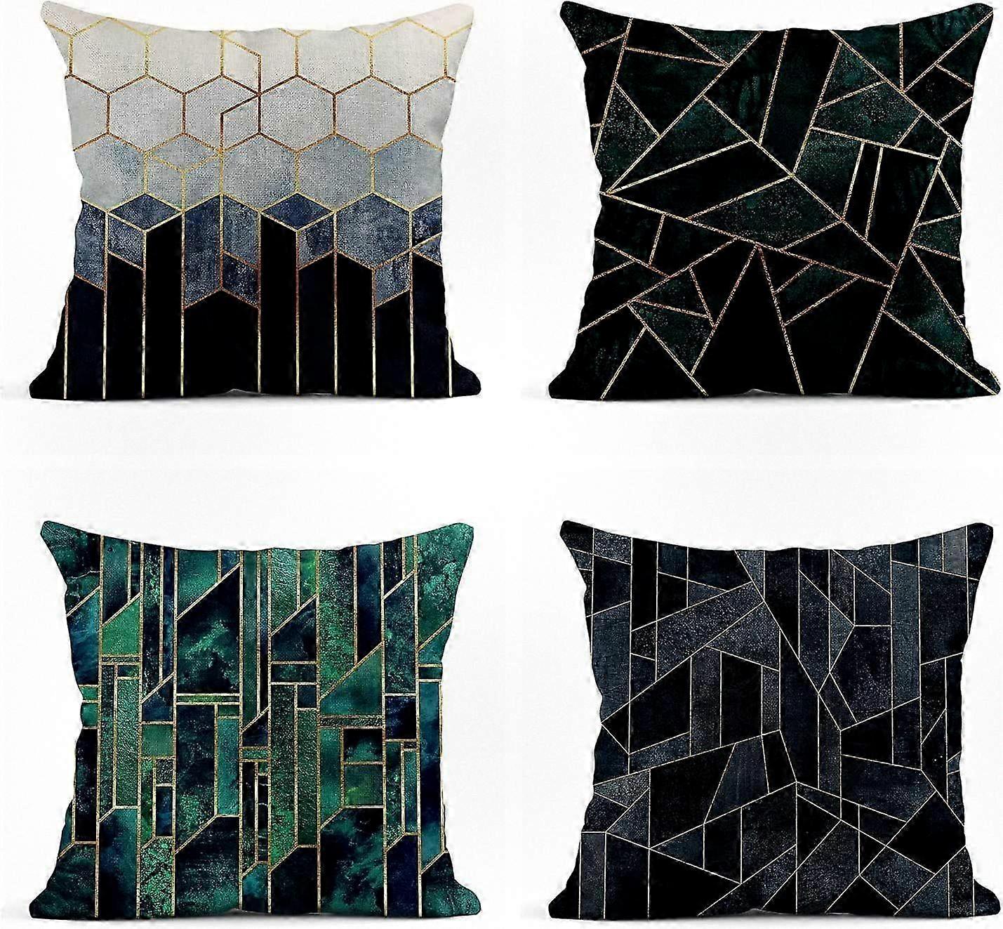 Set of 4 Linen Throw Pillow Covers 18x18 Inch Green Gray Modern Geometric Design with Golden Lines Pattern Home Decor Pillowcase Square Cush