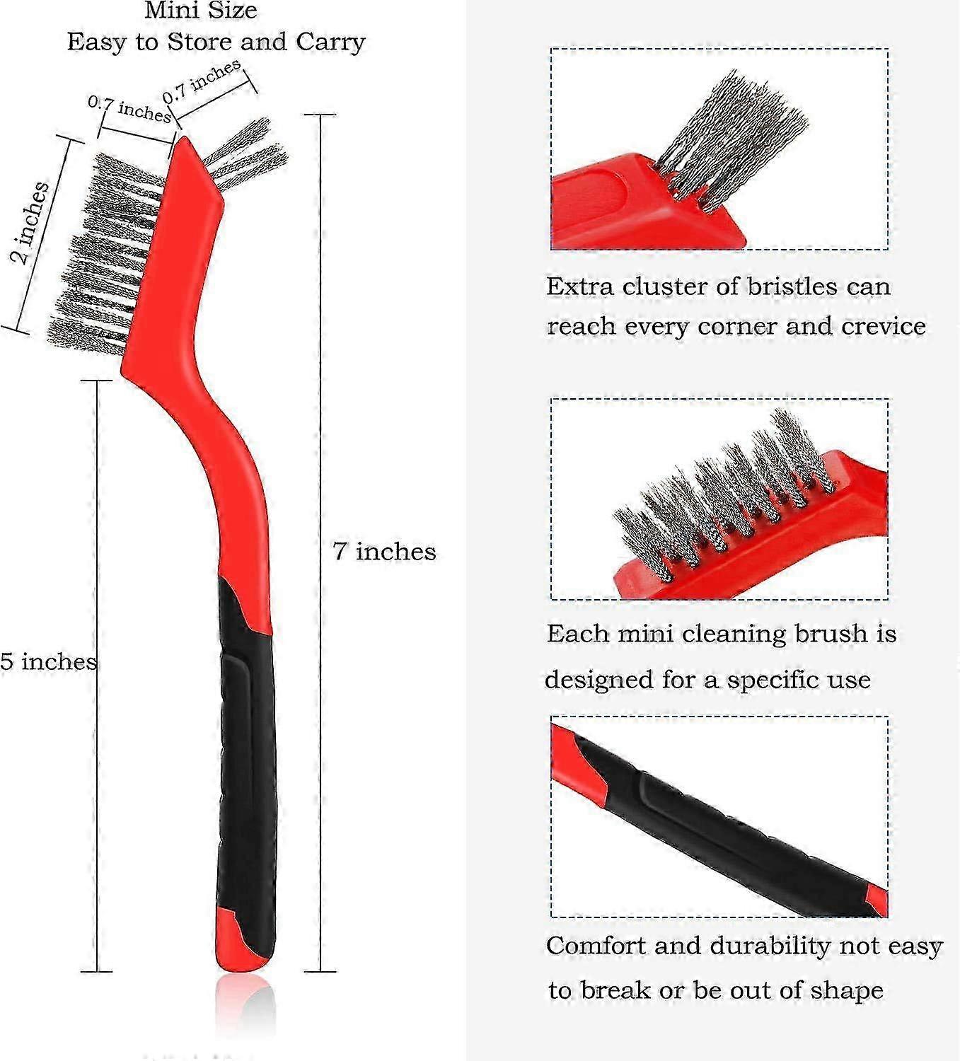 "【Improved】The material of the brush bristles have been improved and passed the long-term anti-rust test.And also increased the number of brush bristles to make them stronger and more resistant to deformation. Whether it is deep cleaning, paint removal or rust removal, it can be easily completed. 【Muti-use】Brass brush can be applied to clean unfinished metal parts without damaging surfaces or fine features;Stainless steel brush can be applied to clean parts that need heavy duty scrubbing, paint, rust,car parts. Nylon brush can be applied to clean delicate areas that need to cleaned gently. 【Well designed】The brush handle is made of rubber, which is non-slip and durable. The curved design improve the comfort of holding and work efficiency. In addition, the rear of the handle has a hole for easy hanging. 【3 Styles】Package contains 2pcs brass brushes, 2pcs stainless steel brushes and 2pcs nylon brushes.6 pieces in total, different styles can easily cater to most people's needs. 【Portable】3 styles of wire brushes come in same size, total length of the wire brush is approx.7 inches, brush head is approx. 1.6 inches, handle length is approx. 5.1 inches and handle width is approx. 0.4 inches, which makes them easy to store and carry." Note: Due to the light and screen setting difference, the item's color may be slightly different from the pictures. Please allow slight dimension difference due to different manual measurement. Sold by-Minnanxin