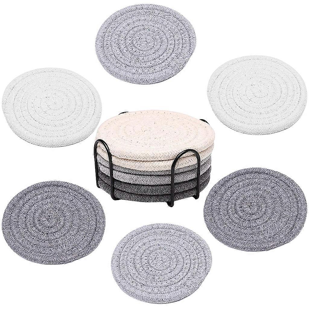 6 Pieces Absorbent Drink Coasters Set Cotton Woven Coasters with Black Metal Coaster Holder for Home Decor, Bar, Party