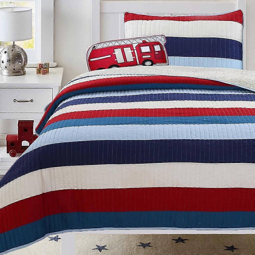 2-Piece Reversible Quilt Bedding Set, 100% Cotton Nautical Navy Blue Red Off-White Striped Coverlet, Bedspread for Bedroom, Apartment - Twin