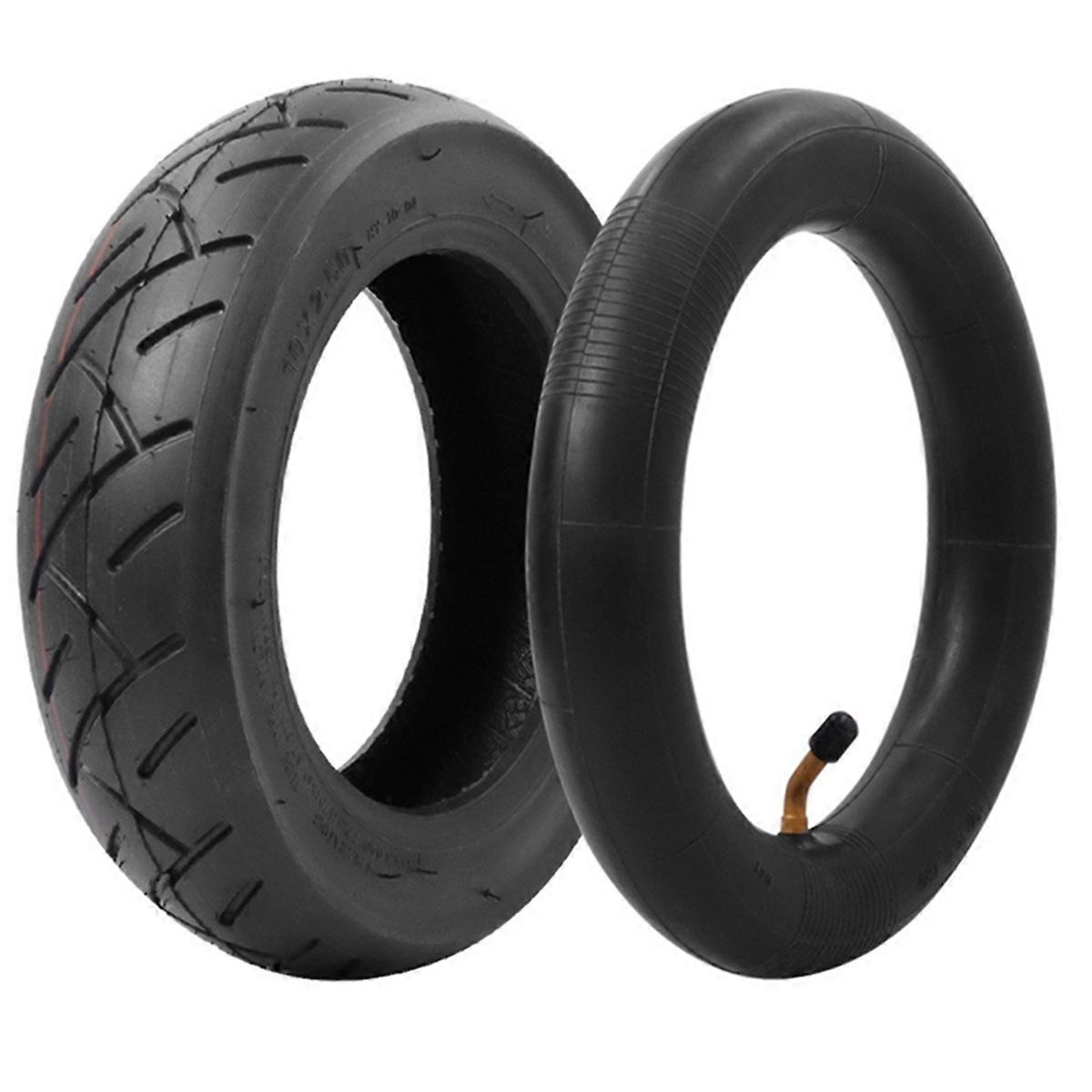 Complete Set for Convenience: This package includes 1 x 10*2.5 tire suitable for a 6" Rim and 1 x inner tube with a 45° valve and dust cap. to check the tire size and valve type before purchase to compatibility. Universal Fit for 10" Wheels: Designed to replace most 10" tires, this 10x2.5 tire is compatible with electric scooters including 36V, 48V, 400W, 500W, and 800W hub motors, Hoverboards, Swagcycle, and Quick 3 electric scooters. Construction: Crafted from high-quality rubber, our tires are built to withstand pressure and abrasion. They are yet , offering an airtight seal and a professionally designed tread pattern for enhanced grip on slippery surfaces. Effortless Installation: Replacing your scooter's tire and tube is straightforward with our set. The process requires minimal steps and effort, making it simple enough for anyone to handle without extensive instructions. Optimal Performance and Safety: The robust material and advanced tread design a safe and smooth ride by improving traction and durability. Perfect for upgrading your scooter for better performance on terrains. Color: Black Material: Rubber Package Contents: 1 *Tire+1* Inner Tube Only the above package content, other products are not included. Note: Light reflection and different displays may cause the color of the item in the picture a little different from the real thing. The measurement allowed error is +/- 1-3cm.