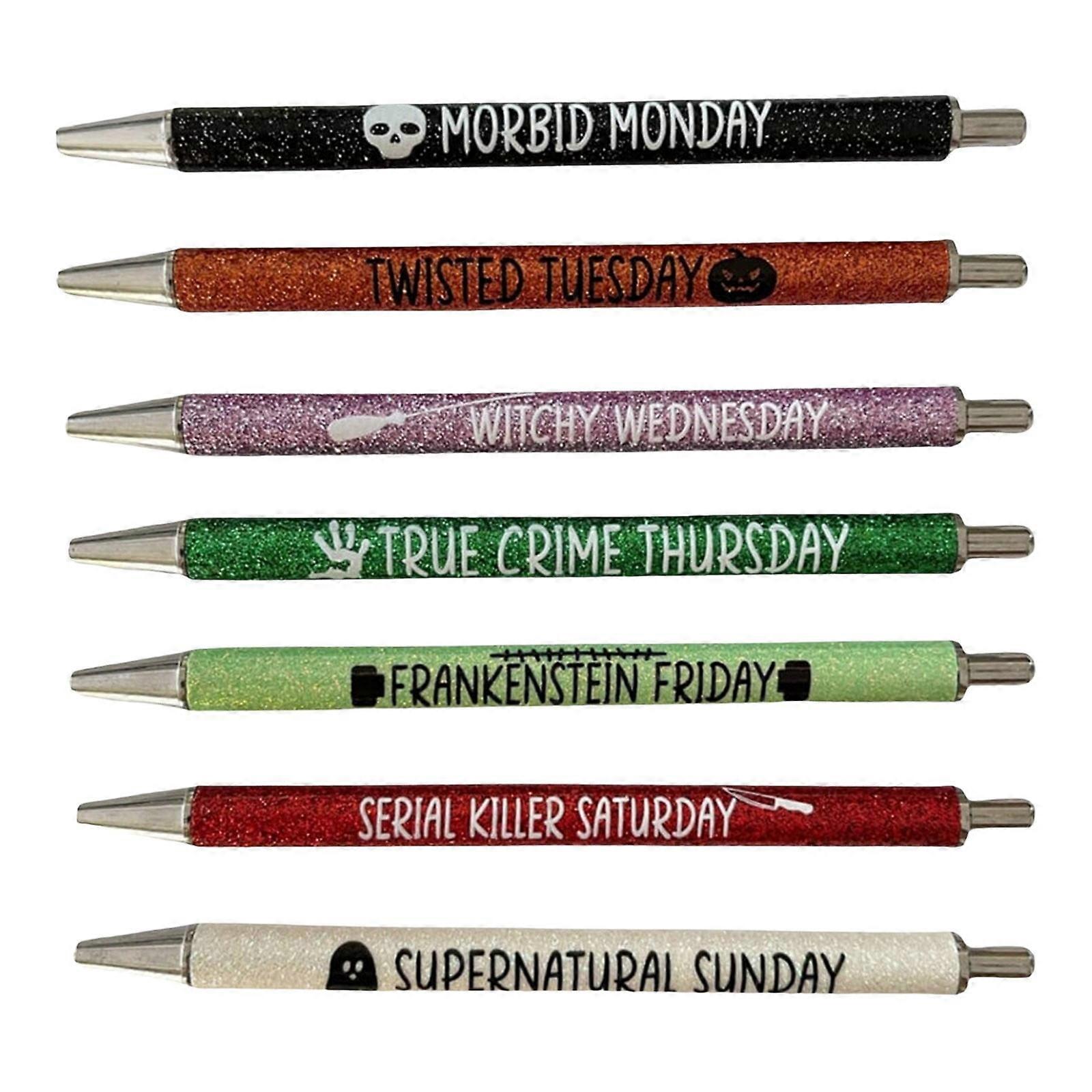 Halloween Weekday Glitter Pen Set 7PCS, Compatible with Office Decor, True Crim Witchy Supernatural Frankensteine Days of The Week Pens 8ml