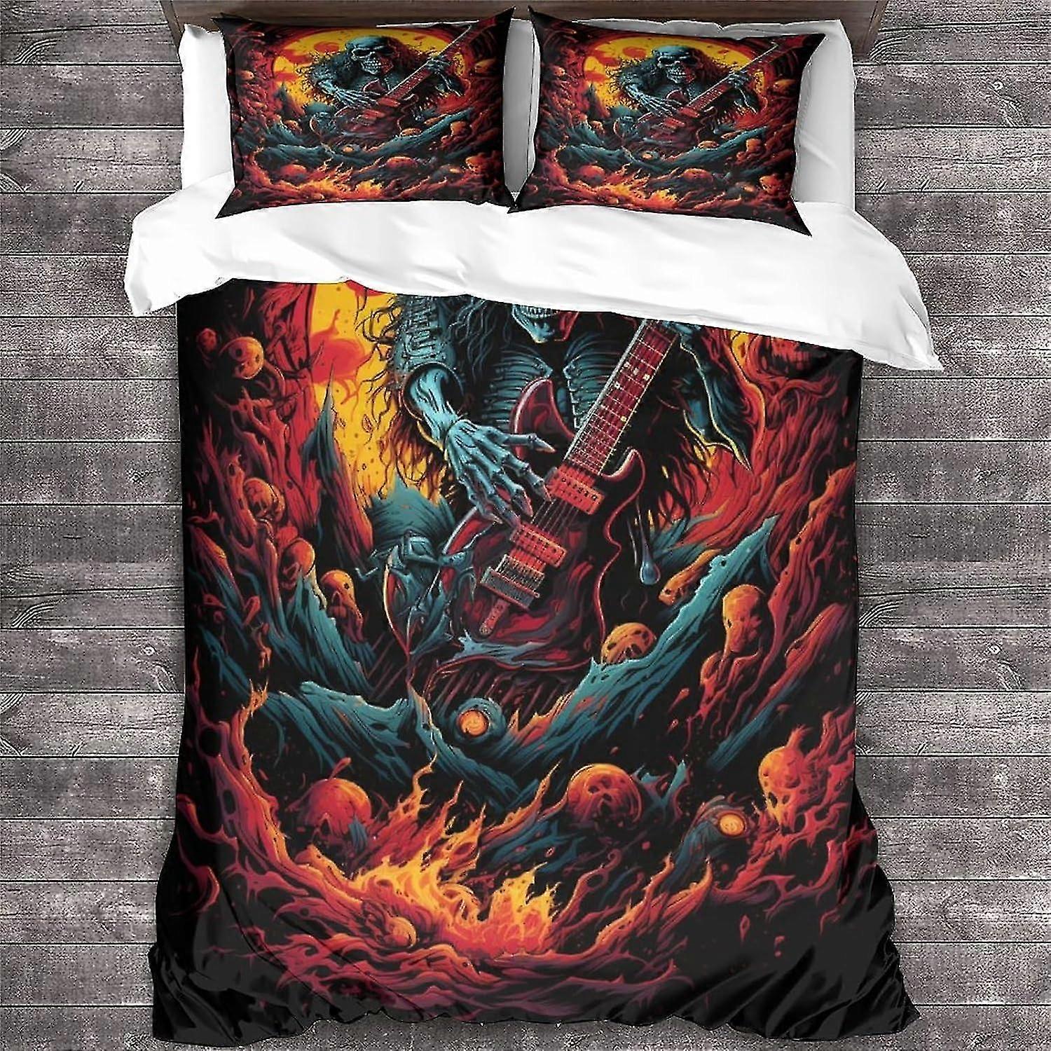 3 Pieces Rock 'n' Roll Duvet Cover Set with Pillowcases, Skull Print Bedding with Zipper Closure, Heavy Metal Guitar King Size Quilt Cover