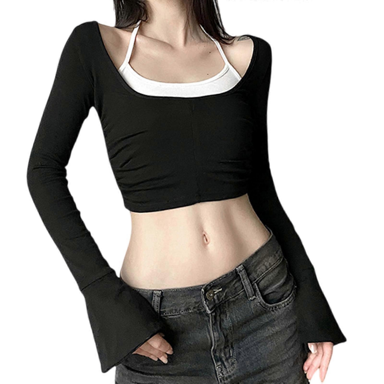 2 Piece Color Blocking Outfit for Women Long Sleeve Off Shoulder Crop Top with Slim Fit Halter Neck Camisole Set black and white S