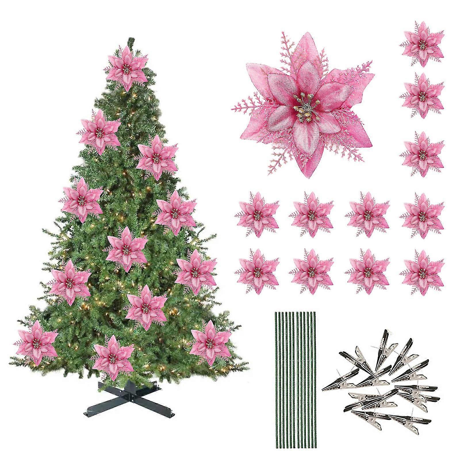 Christmas Glitter Poinsettia Flowers Set - Pack Of 12, Gold, Perfect For Tree Decorations,Pink