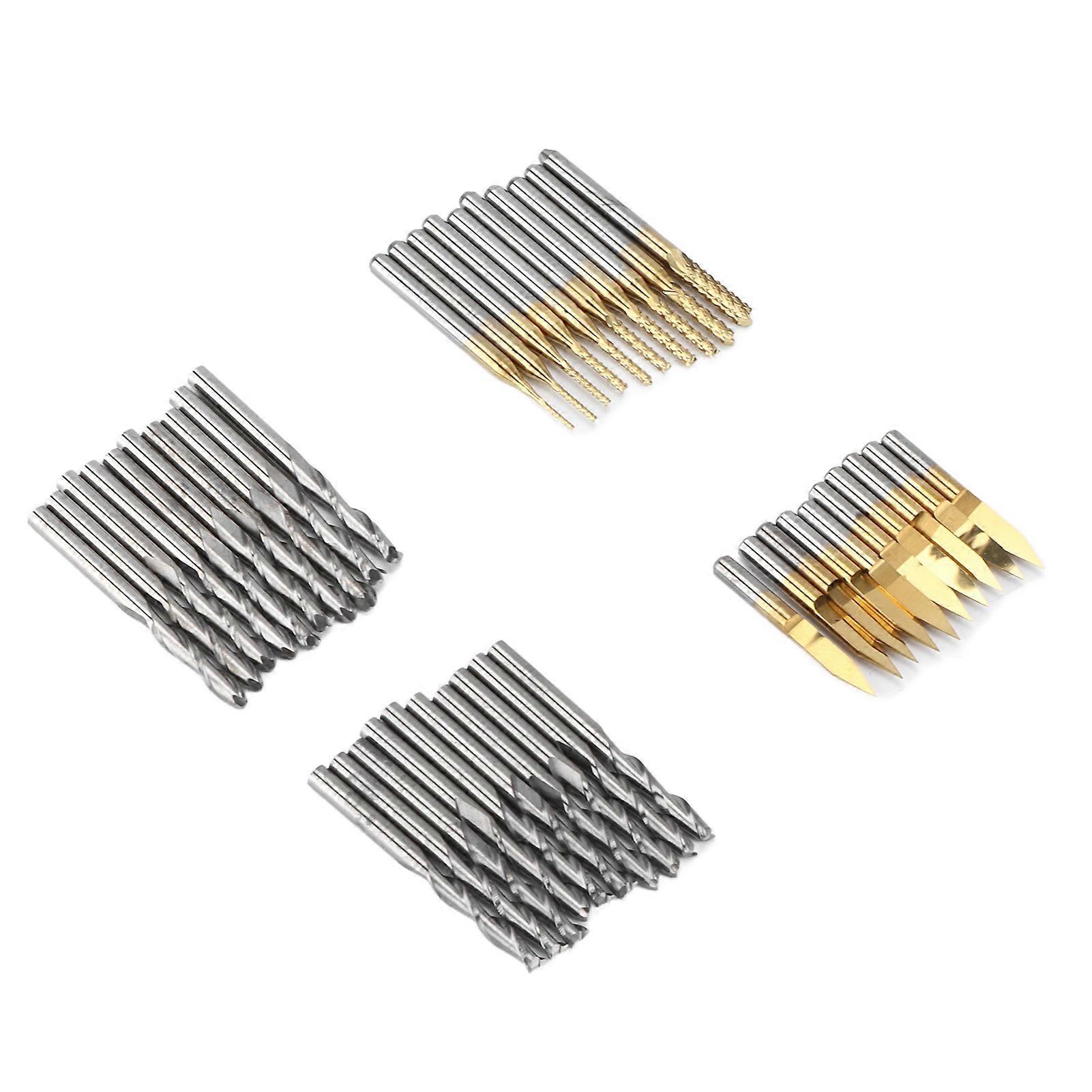 40Pcs Milling Cutter End Mill CNC Router Bit Flat Ball Nose Set Kit for Engraving Item Type: Milling Cutter Model: WX01240PCTZ03 Material:High Speed Steel Shank Diameter: 1/8in (3.175mm) Total Length: Approx. 38mm / 1.5in (Manual measurement causes error within 1 to 3mm) Specification: 10 x 0.8-3.0mm PCB Milling Bit 10 x 30x0.1mm Engraving Bit 10 x 3.175x17mm Flat End Mill 10 x 3.175x17mm Ball Nose Mill