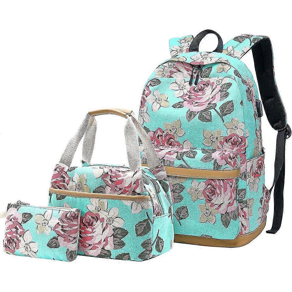 HJYang Canvas Backpack Set Flowers Print With Lunch Box Bag And Pencil Case AR[