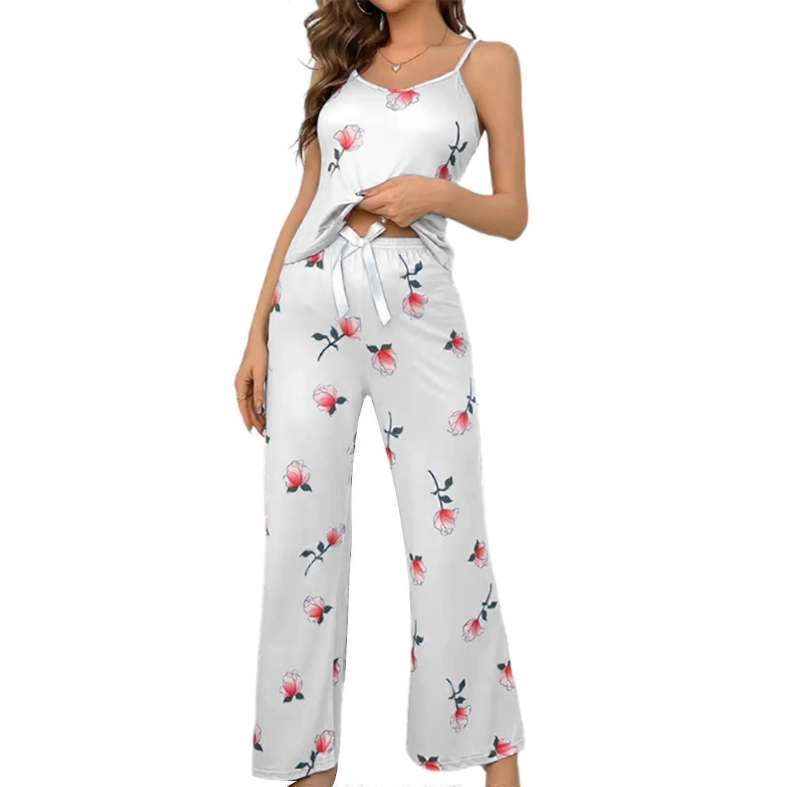 Flower Print Spaghetti Strap Camisole and Bowknot Elastic Waist Long Pants Pajama Set for Womens Sleepwear Nightwear White XL