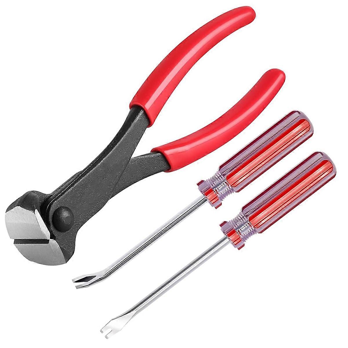 The upholstery and construction staple remover set contains 7-inch end cutter pliers, 1pc 8-inch straight V-shaped and 8-inch bendable V-shaped pullers, catering your daily repair needs for furniture maintenance, flooring installation, carpet refinishing and more. No Damage to : cutting pliers with fat and round not damage the of the object needed to pull the tacks out. The staple pullers feature a labor-saving lever design with a 3.5-inch long handle that easily removes all stubborn clips and staples without damage. Perfectly remove the staples your furniture and floor without damaging the . 2 in 1 End Cutting Pliers: Made of high Metal with quenching treatment for rust and resistance. HRC 58-64 jaw is designed for flush cutting steel wire(up to 1.2mm); The ergonomic rubber handles offer more comfortable grip and reduce hand pressure. Not only great for twisting, cutting, pulling, trimming, and binding wire, but also for pulling out staples and cutting off nails, copper, aluminum, steel, screws and other metal hardware. 2 Types Lifter: Made of Metal with acetate and ergonomic handle that is designed with leverage for comfortable grip, allowing you quickly remove deeply embedded staples. Straight V-tip puller is ideal for pulling nails that are on a flat , and the curved -tip puller under staples, tacks and brads, loosening them with ease. Wide Application:A must-have tool for , handymen, professionals or amateur. The upholstery tools is not only used to pull nails, cut wires, cut steel wires, but also easily remove staples from boards, tires, furniture, carpets, picture frames, cardboard boxes, u-shaped staples, rivet, tire nails. Warm Note: NOT for prying nail which is too tight or too big to avoid damaging the tool. Colour:As Shown Material:Metal Package Contents: 1 x Staple Remover Set Only the above package content, other products are not included. Note: Light reflection and different displays may cause the color of the item in the picture a little different from the real thing. The measurement allowed error is +/- 1-3cm.