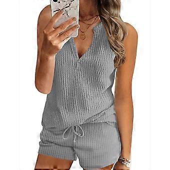 Women Tank Top Shorts Set V Neck Pure Color Drawstring Closure Summer Vest Shorts for Home Wear