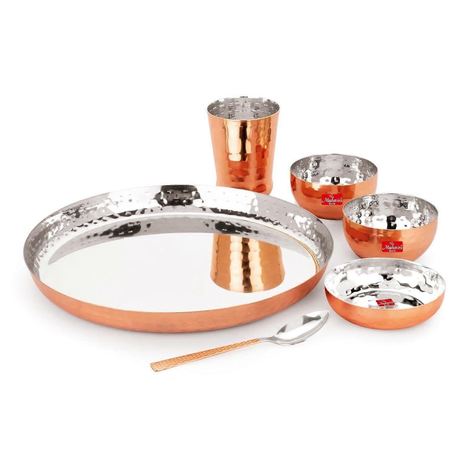 MADE IN INDIA ASIN - ‎B0F1V7TR87 Colour Gold Pattern Solid Collection Name Hammered Finish Dinner Set COMPLETE SET: Traditional copper dinner set includes 1 thali (dinner plate), 2 bowls, 1 sweet dish, 1 glass, and 1 spoon for a complete dining experience PREMIUM MATERIAL: Crafted from high-quality copper with an elegant hammered finish that adds a traditional touch to your dining table VERSATILE USE: Perfect for both home dining and restaurant service, suitable for serving Indian and international cuisine AESTHETIC DESIGN: Round-shaped pieces with distinctive hammered pattern create an attractive presentation for your meals TRADITIONAL ELEGANCE: Maahavira Gold's copper dinnerware combines classical Indian dining culture with contemporary functionality