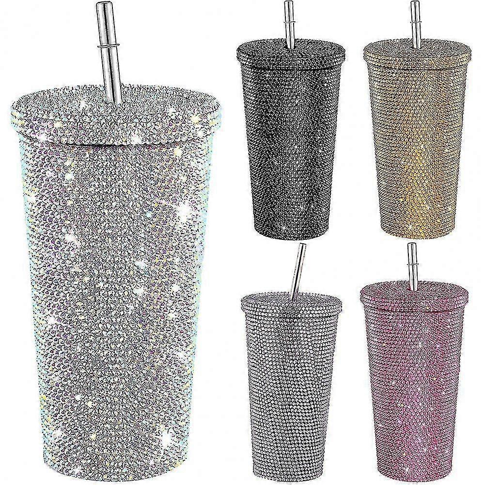 500ml Straw Cup With Lid Reusable Rhinestone Stainless Steel Double Layer Thermos Cups Women Glitter Cup Water Bottle Gift 2023